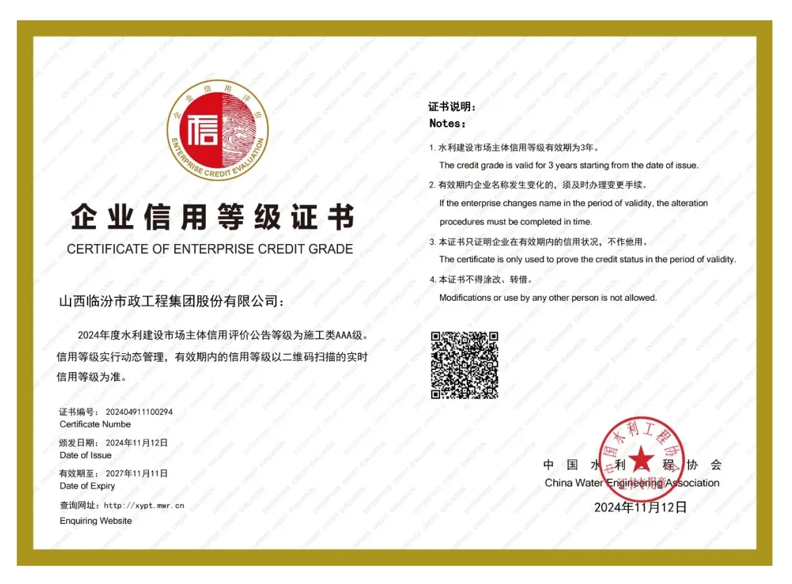 11月12日,中國水利工程協(xié)會公布《施工、監(jiān)理、招標(biāo)代理、質(zhì)量檢測單位信用評價結(jié)果公示名單(批)》,山西臨汾市政工程集團股份有限公司憑借良好的企業(yè)履約能力和投標(biāo)信譽,榮登施工單位AAA級名單,獲頒企業(yè)信用AAA等級證書。