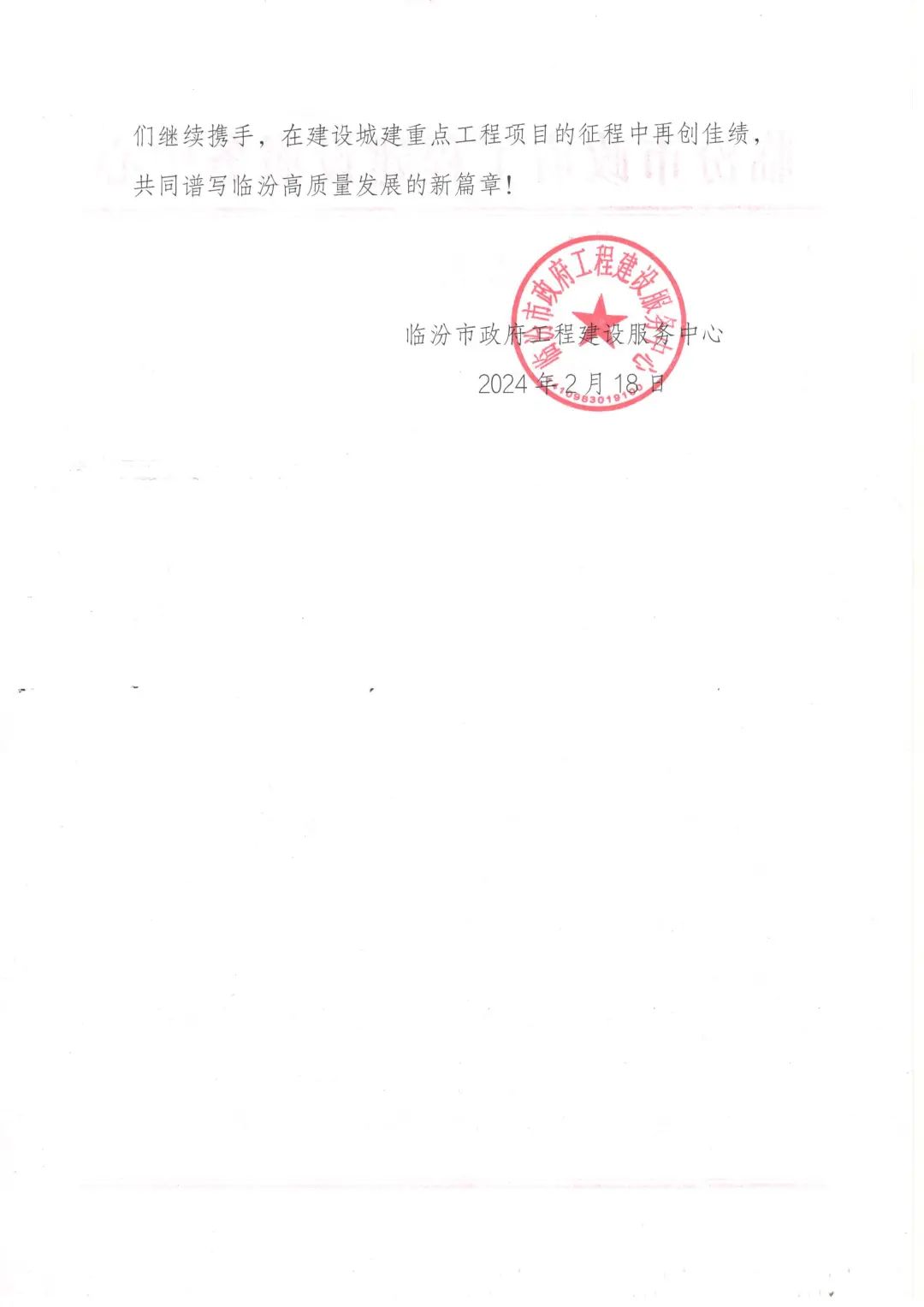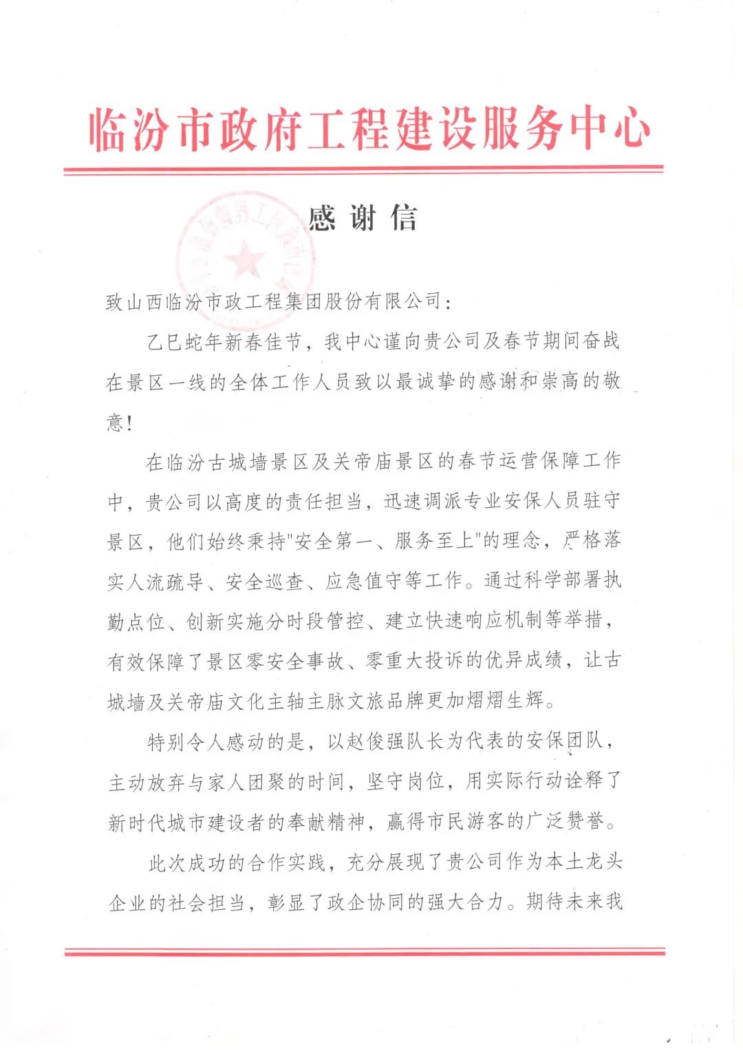 2月18日,臨汾市政府工程建設(shè)服務(wù)中心向臨汾市政集團(tuán)發(fā)來感謝信,對春節(jié)期間奮戰(zhàn)在古城墻和關(guān)帝廟景區(qū)運(yùn)營保障一線的集團(tuán)黨員干部與保衛(wèi)監(jiān)督部工作人員的辛勤付出表示高度認(rèn)可,并致以誠摯的感謝和崇高的敬意。